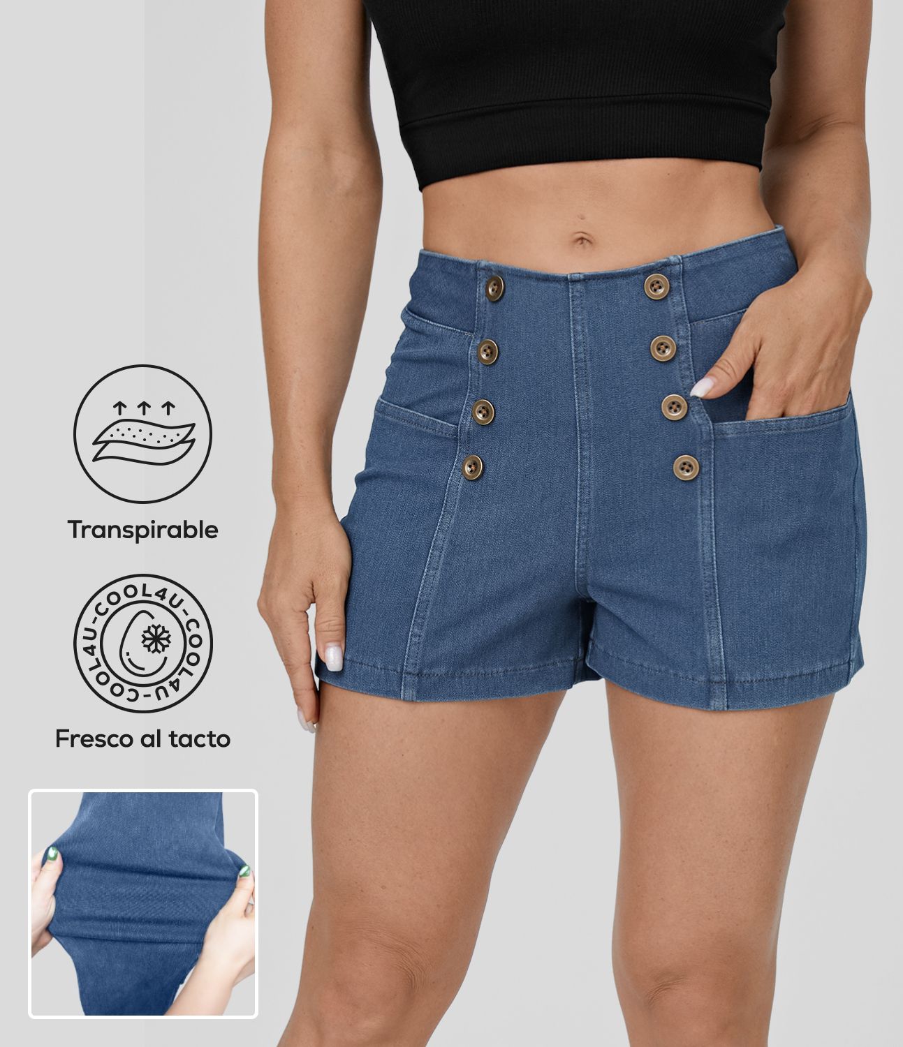 Pantalón Corto Halara Flex™ Denim mezclilla elástica lavada tiro alto botón múltiples bolsillos 2,5 pulgadas