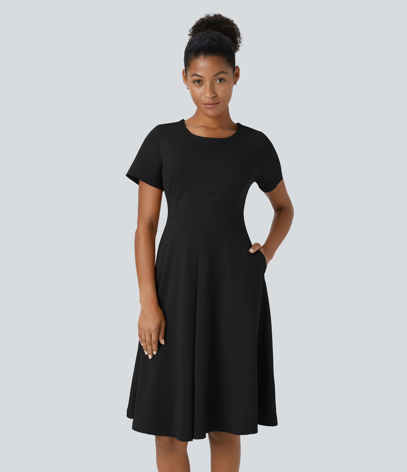 Vestido oficina acampanado midi cuello redondo bolsillo lateral