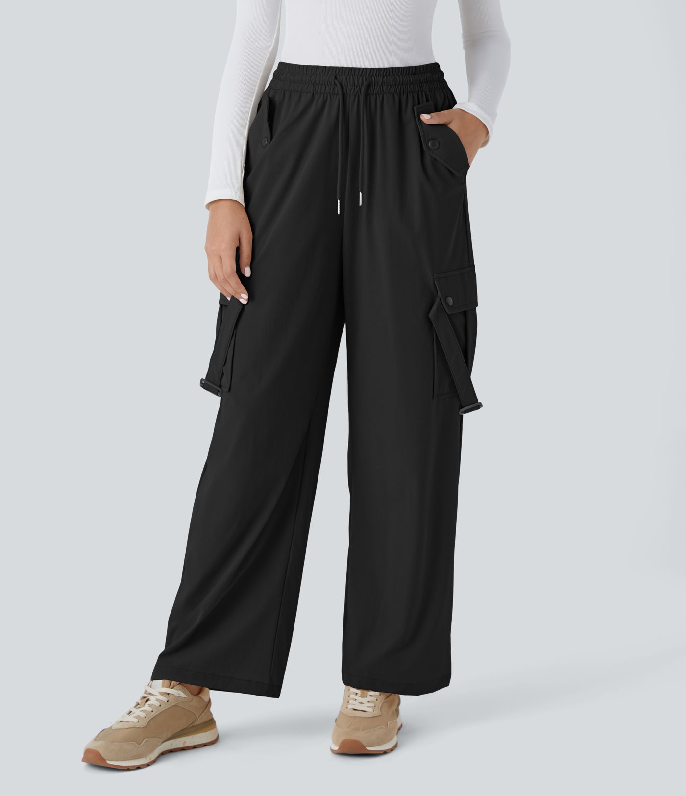 Pantalón cargo múltiples bolsillos y cordón talle medio