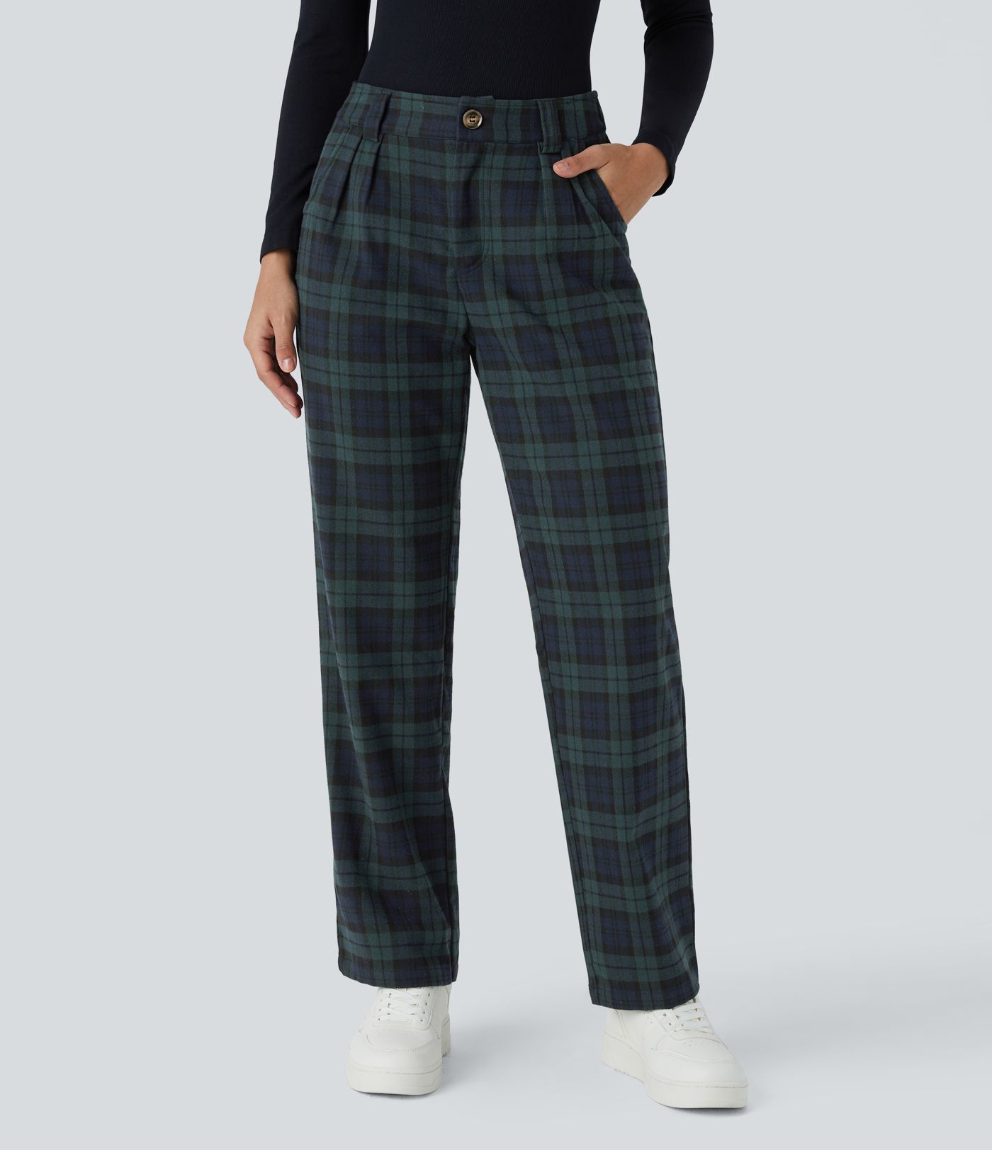 Pantalón tiro medio botón cremallera bolsillo lateral a cuadros de pierna recta