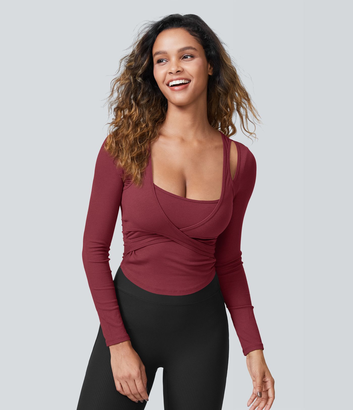 Top deportivo cortado cruzado de punto acanalado de manga larga con escote cuadrado