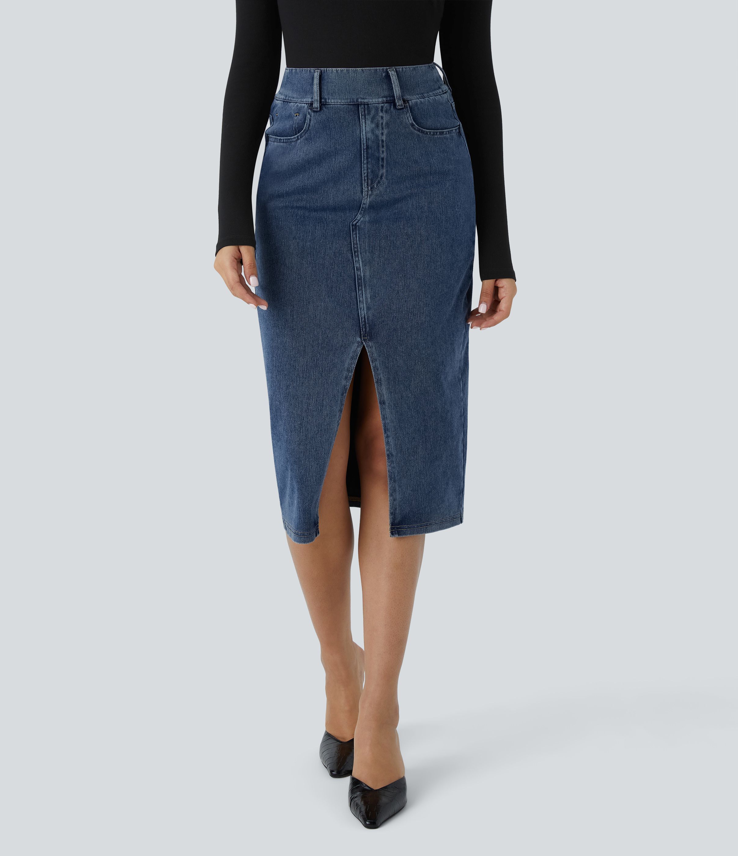 Falda Halara Flex™ Denim mezclilla elástica midi múltiples bolsillos tiro alto