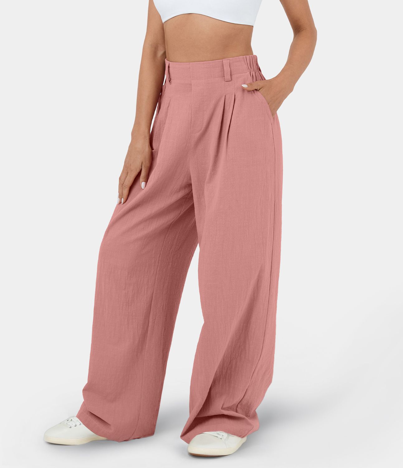 Pantalón palazzo liso fluido pierna ancha bolsillo lateral plisado tiro alto