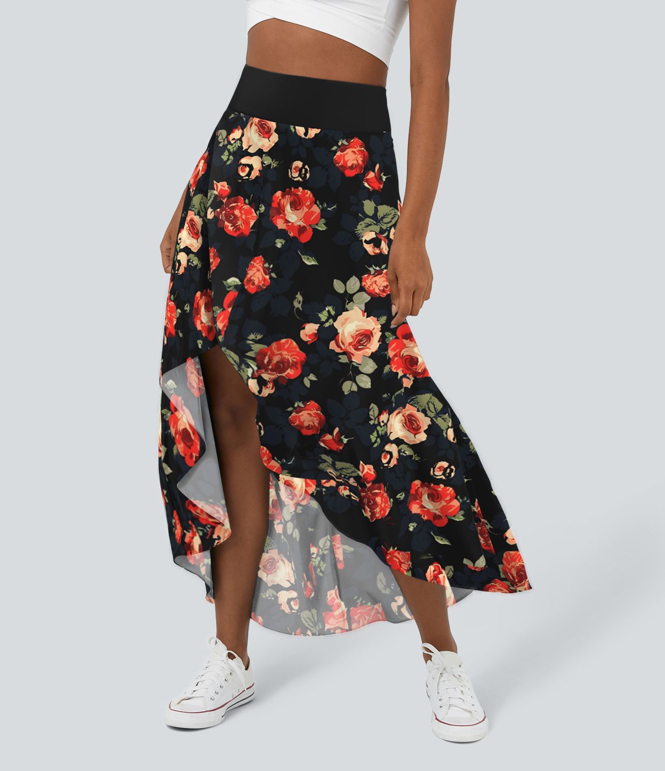 Falda larga regular fluida estampado floral 2 en 1 volante alto bajo tiro alto
