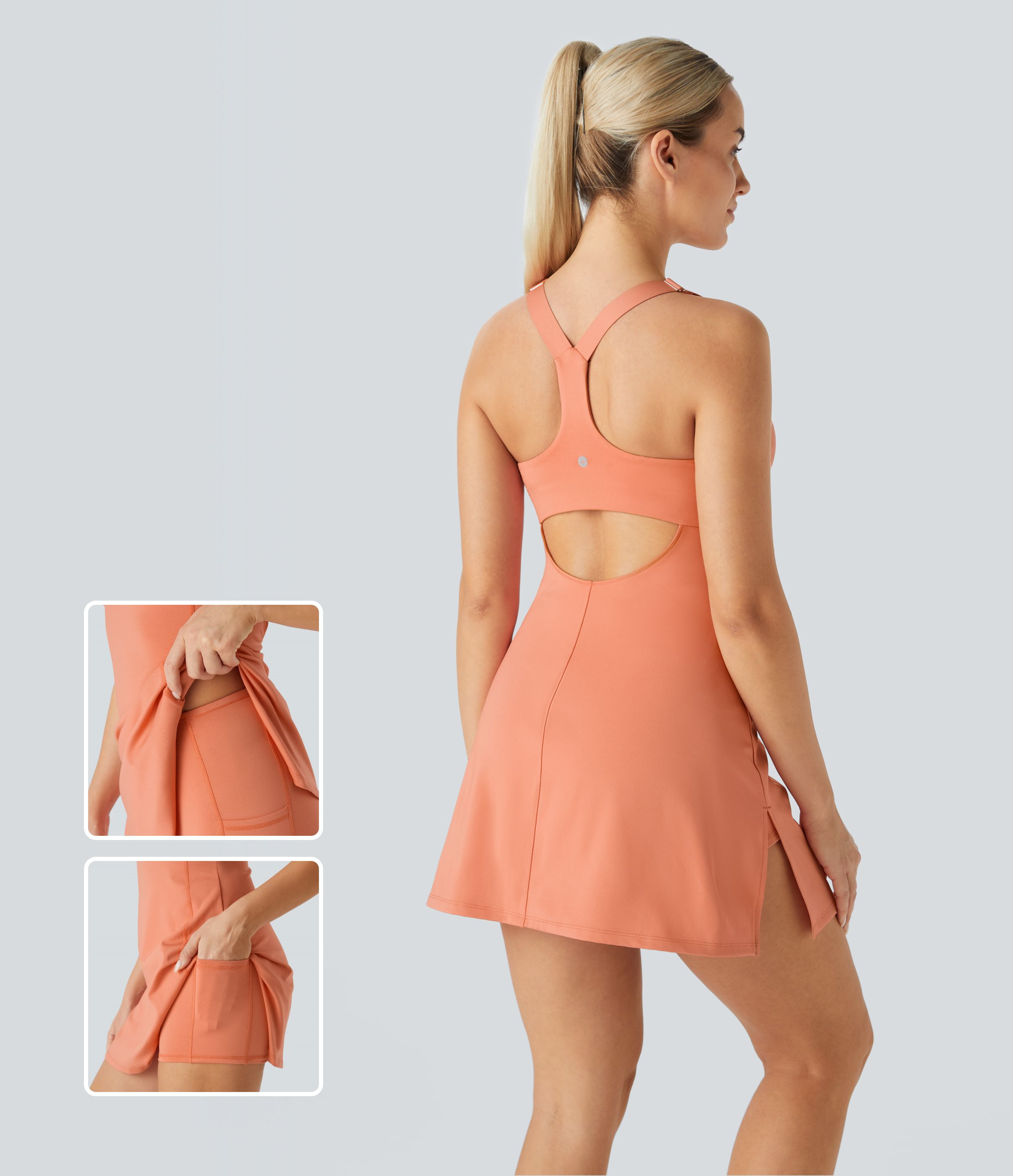 Mini vestido activo Pickleball dividido cuello U correa ajustable espalda cruzada corte bolsillo lateral 2 pieza