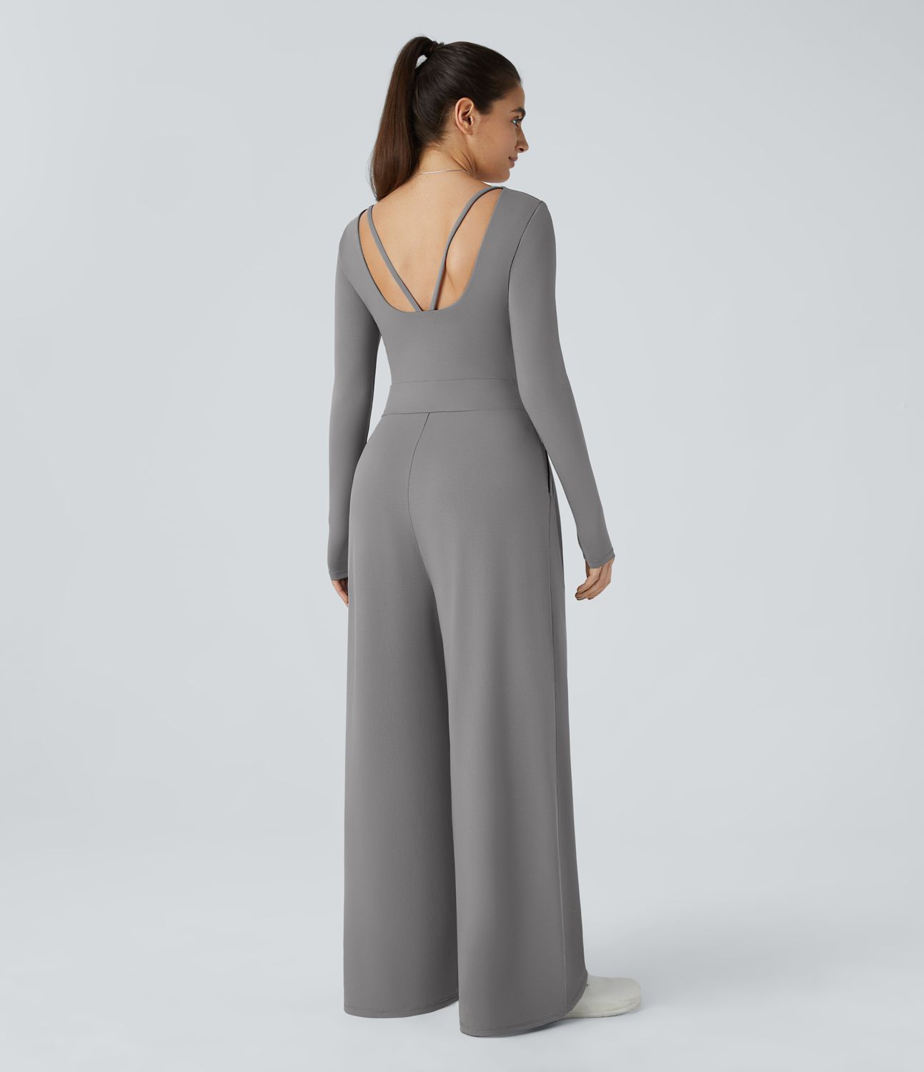 V-neck jumpsuit, backless, long sleeves, side pocket, pleated, wide leg