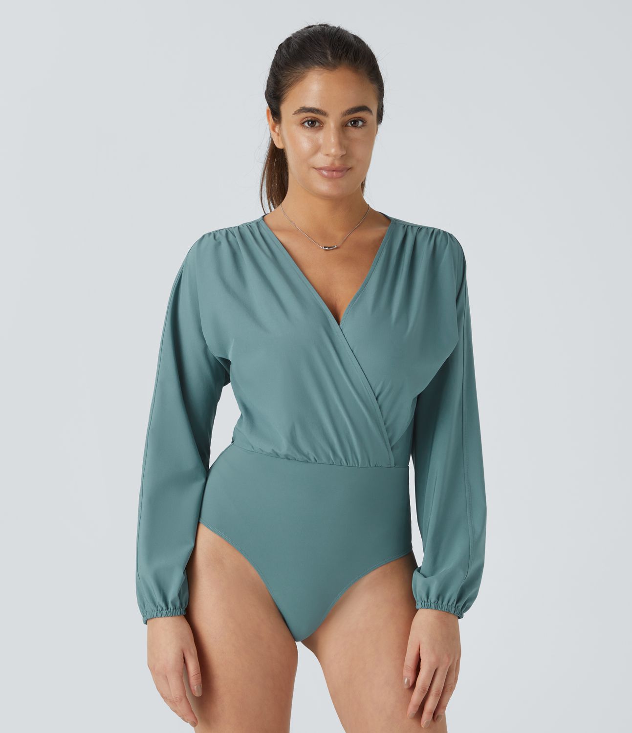 Body Breezeful™ secado rápido botón manga obispo plisada cuello V