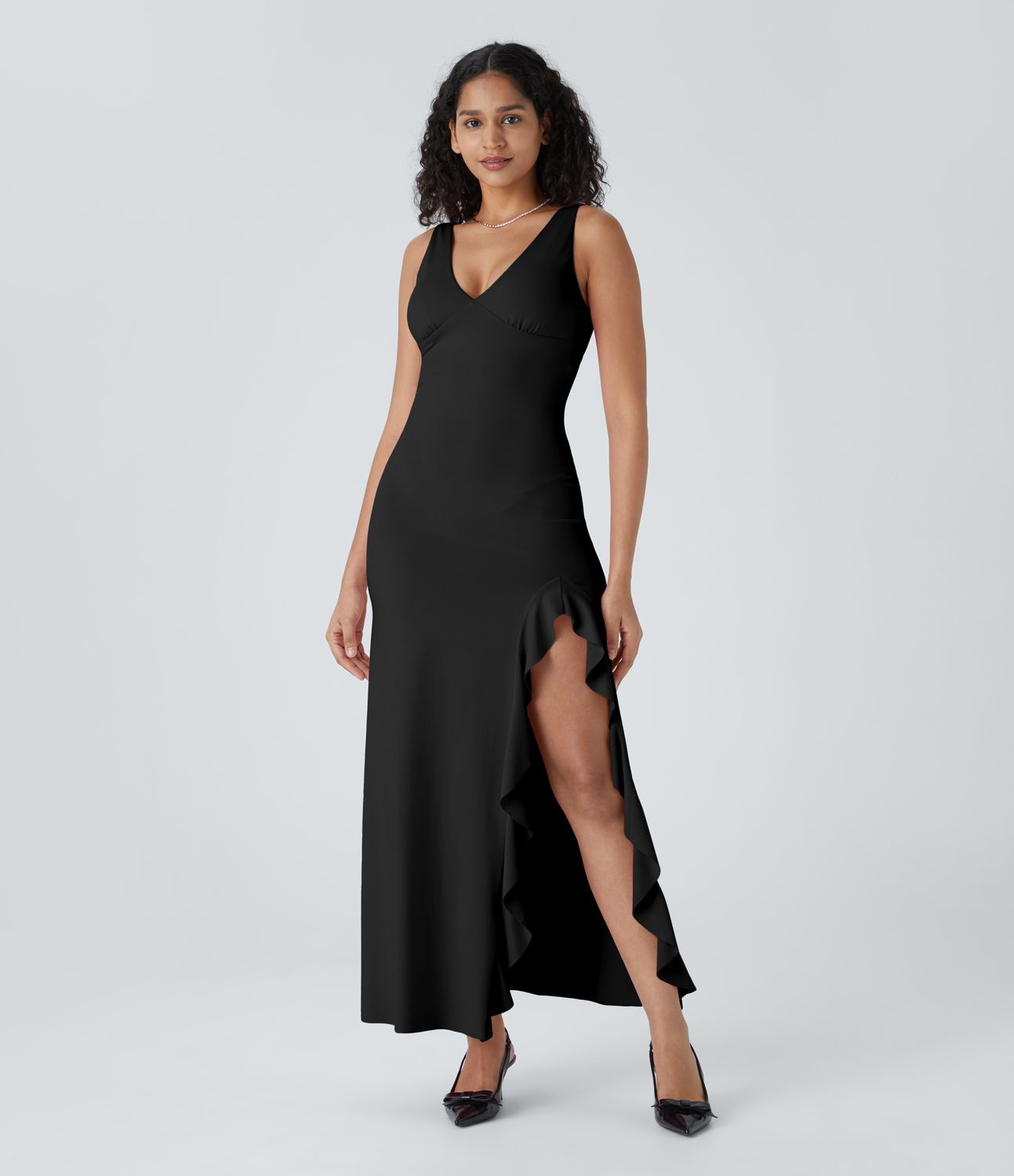 Vestido fiesta largo cuello V sin mangas asimétrico volante dobladillo dividido