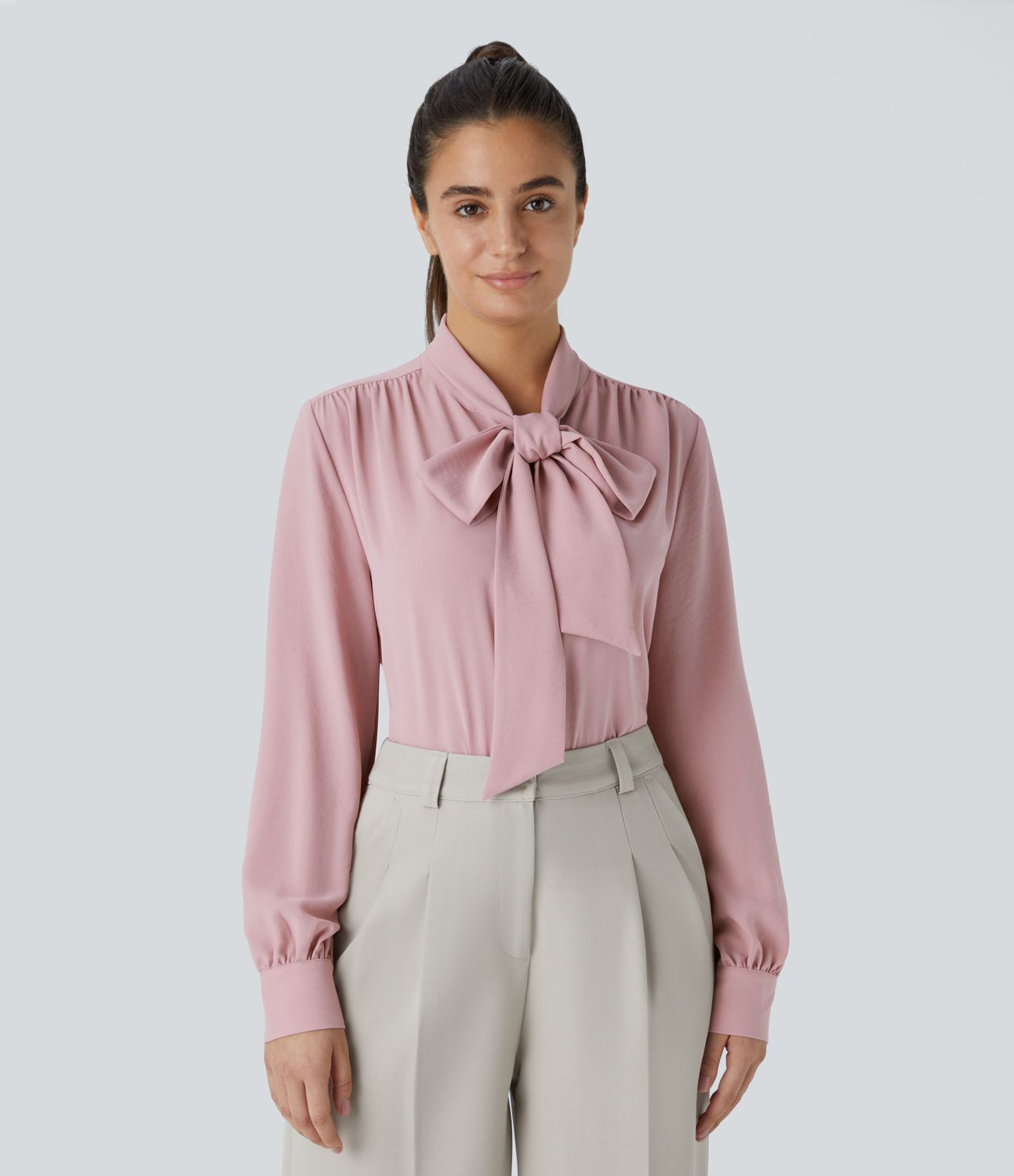 Blusa oficina botón manga larga plisada cuello anudado