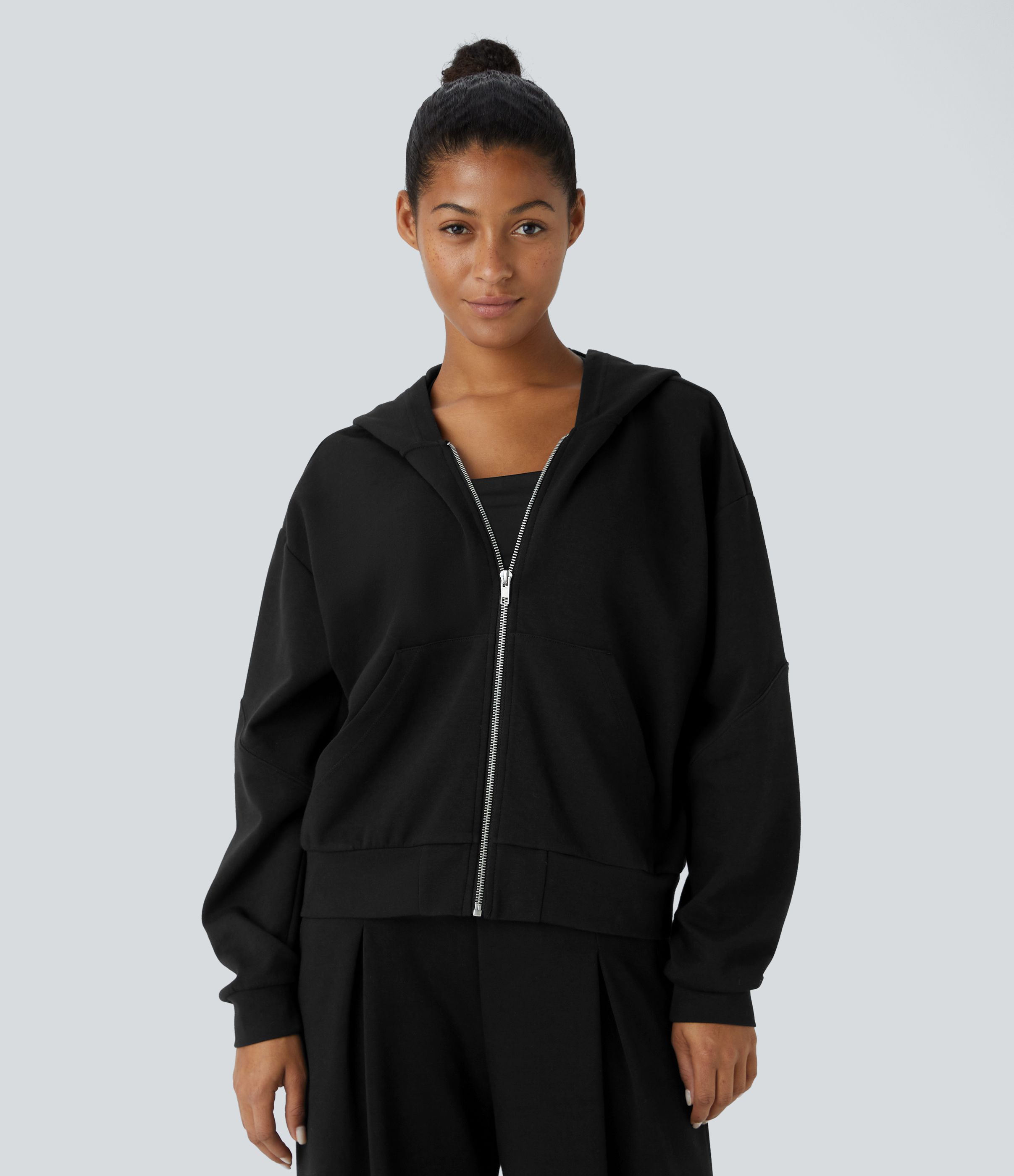Sudadera yoga relajada capucha hombro caído manga larga bolsillo canguro cremallera