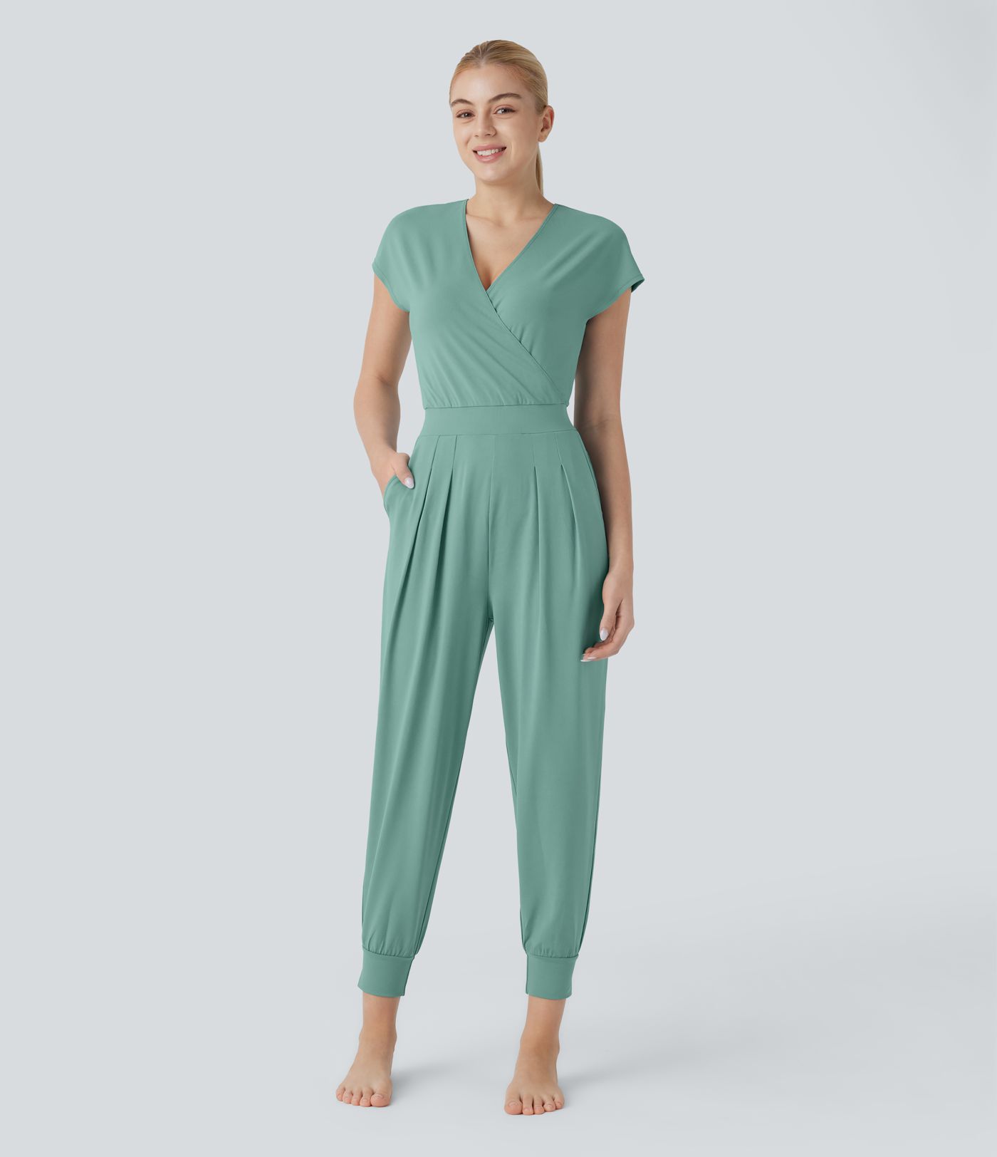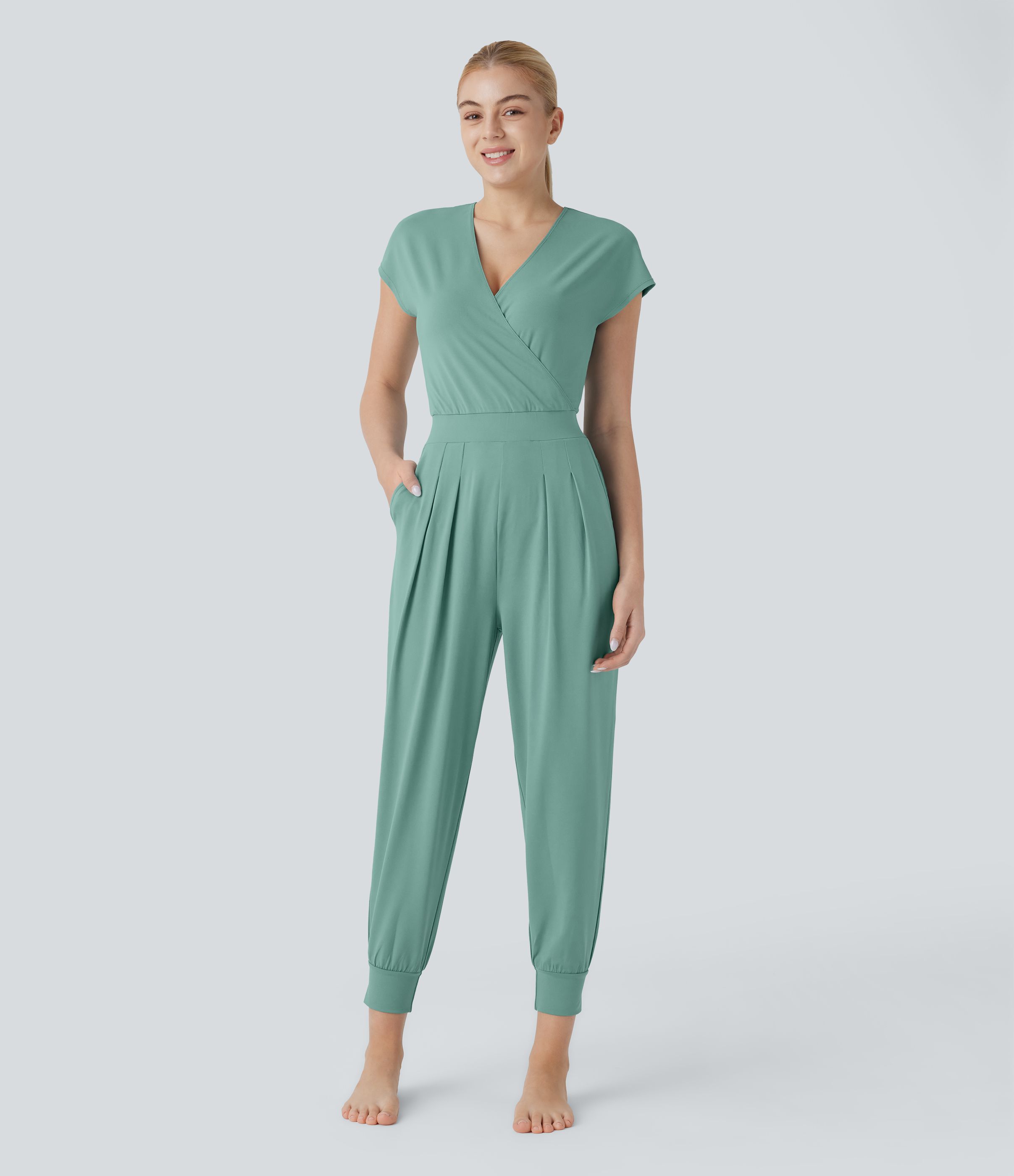 Mono yoga cuello V manga corta cruzada bolsillo lateral