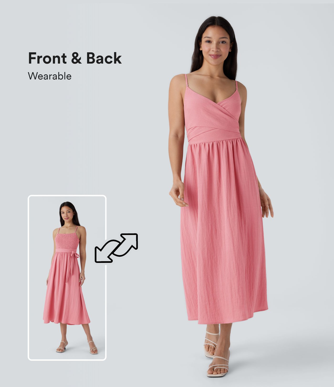 Vestido midi holgado lino tirante ajustable sin espalda fruncido lazo espalda bolsillo lateral usar delante detrás