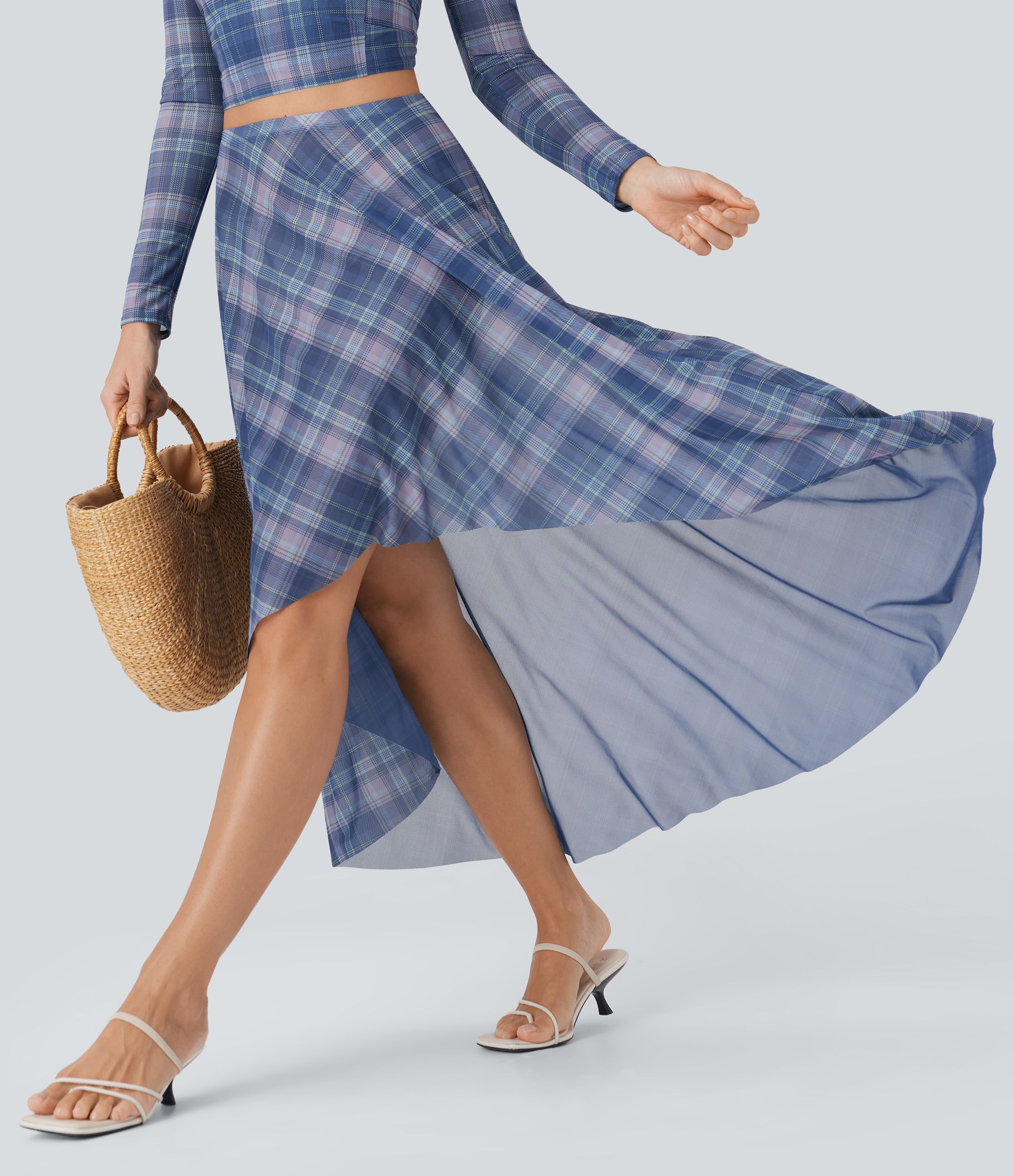 Falda larga fluida con tiro alto de malla transparente con tiro alto y cuadros escoceses