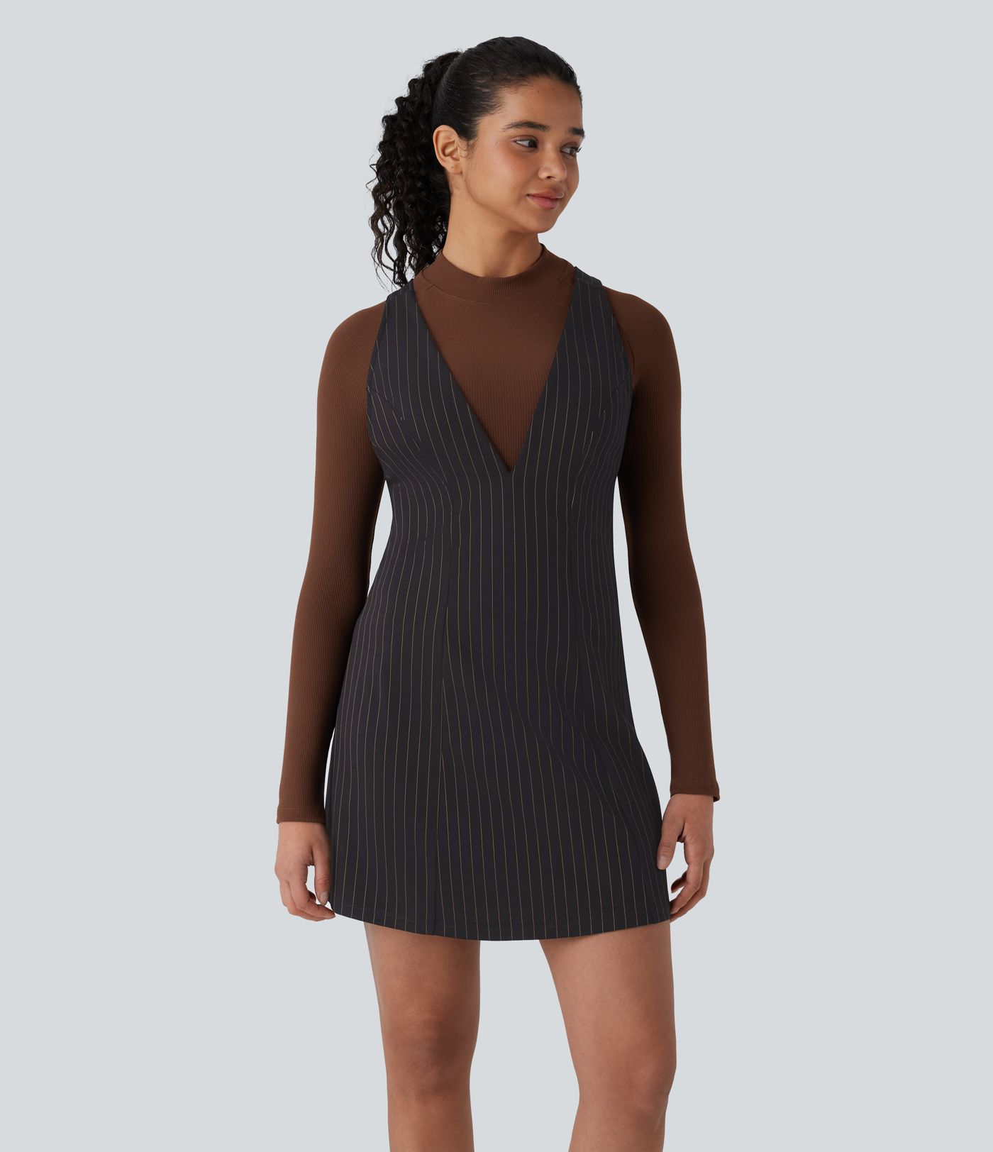 Mini Vestido oficina cuello V tira ajustable botón raya tacto agradable