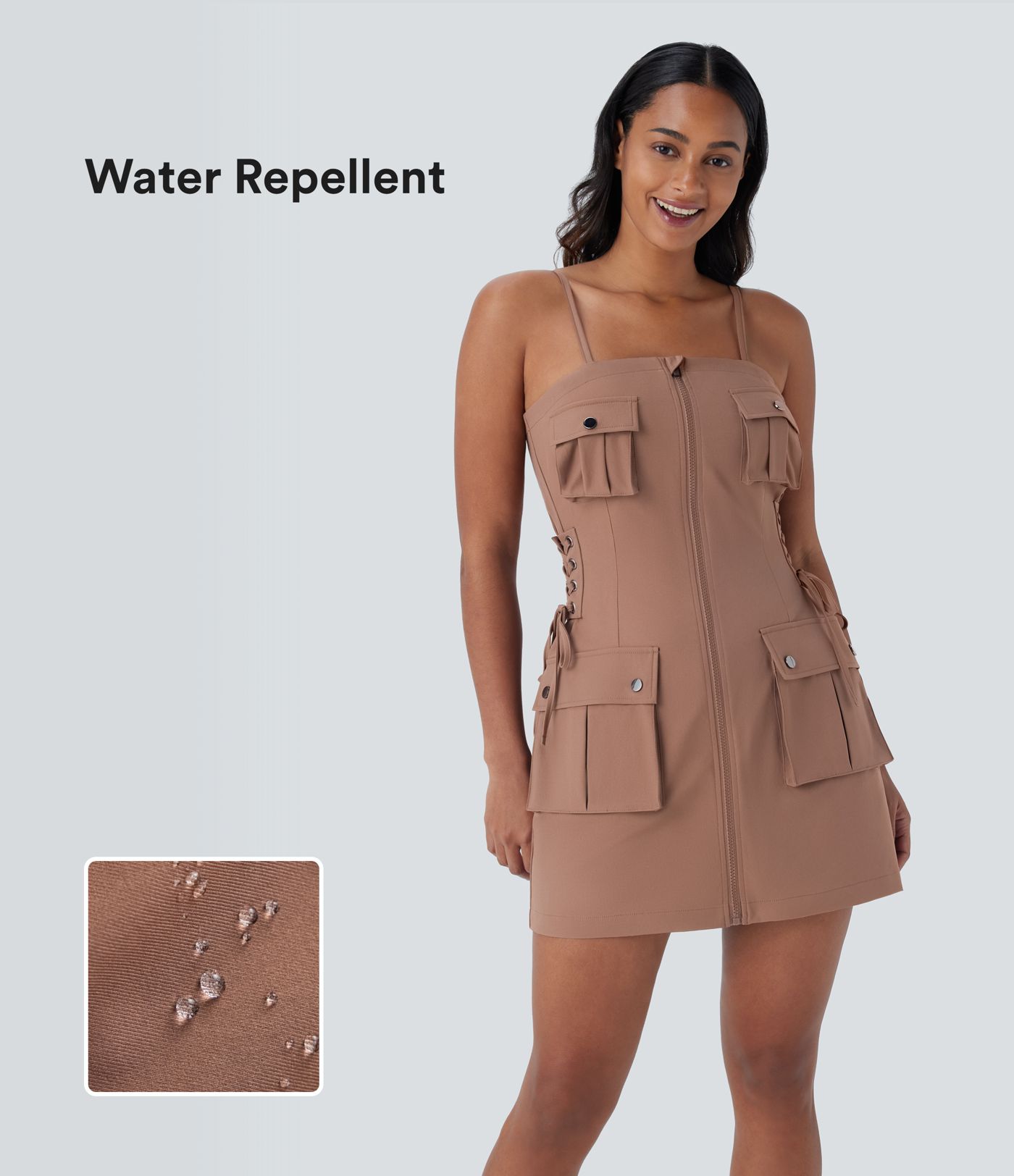 Mini Vestido cargo senderismo sarga cordón lateral repelente agua cremallera múltiple bolsillo