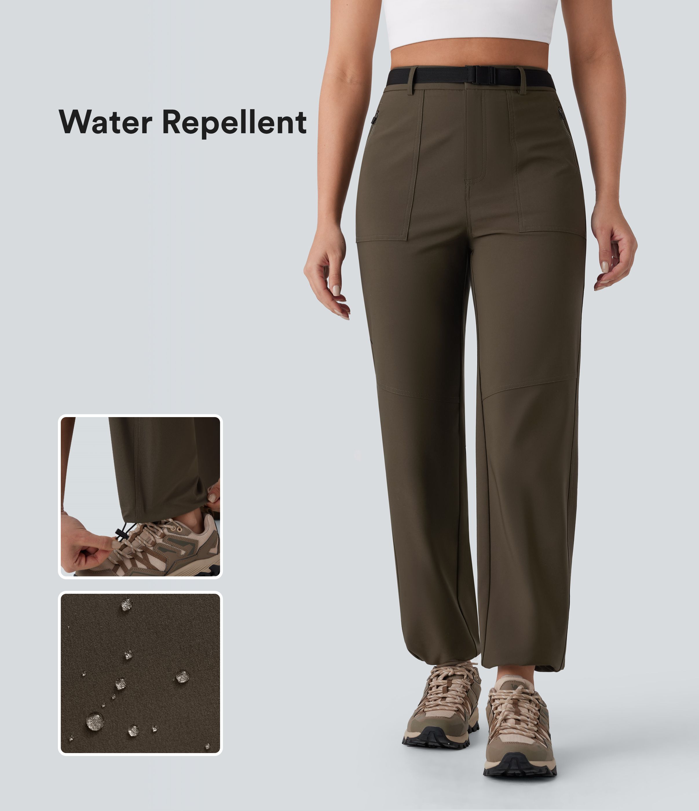Pantalón senderismo tiro alto repelente agua cinturón bolsillo lateral cremallera pierna recta cordón ajustable